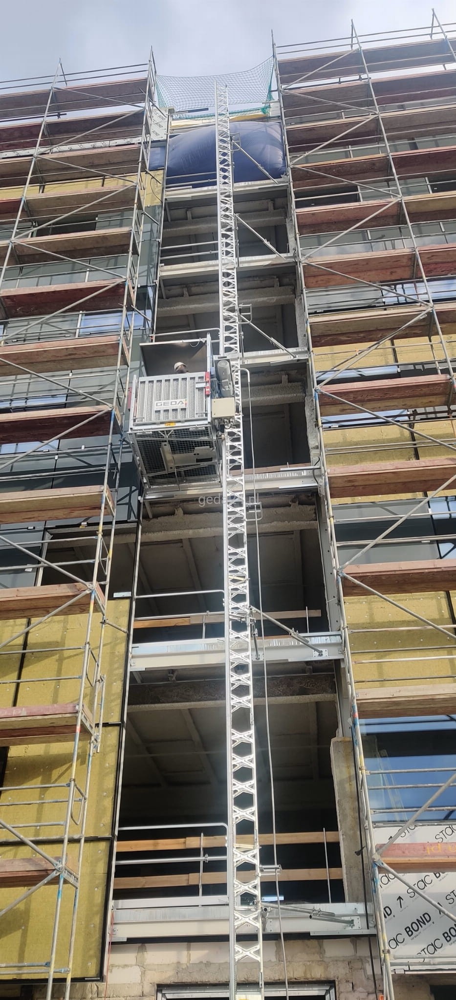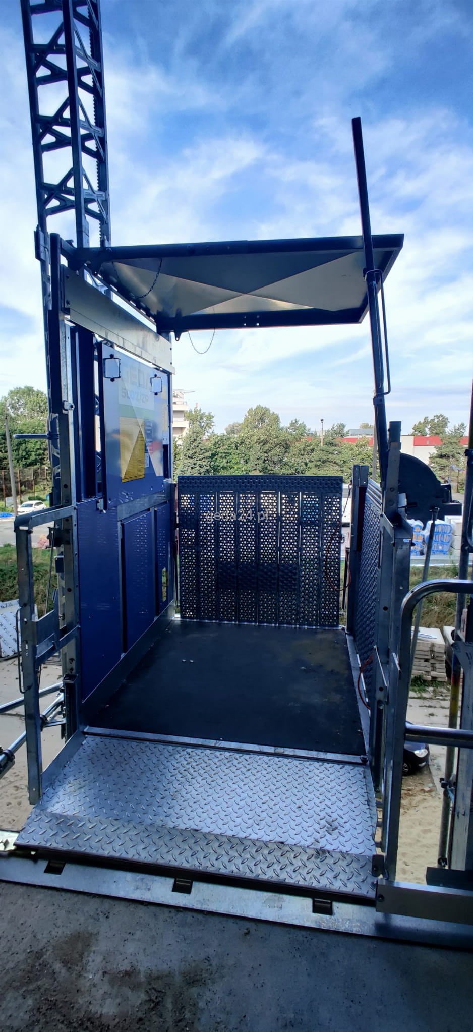 Specjalna platforma towarowo-osobowa z masztem stalowym ocynkowanym oparta na urządzeniu Geda 500 Z/ZP. Urządzenie o specjalnie powiększonym udźwigu towarowym powiększonym z 850kg do 1000kg!
